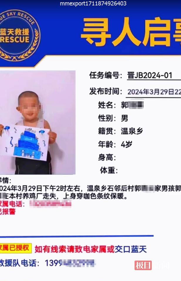 “2024年3月29日下午2时许,温泉乡石岭后村郭某家男孩郭某某在本村养鸡场走失,上身穿咖色条纹保暖……”3月29日晚,上述寻人启事在山西省吕梁市交口县的网友之间传开。